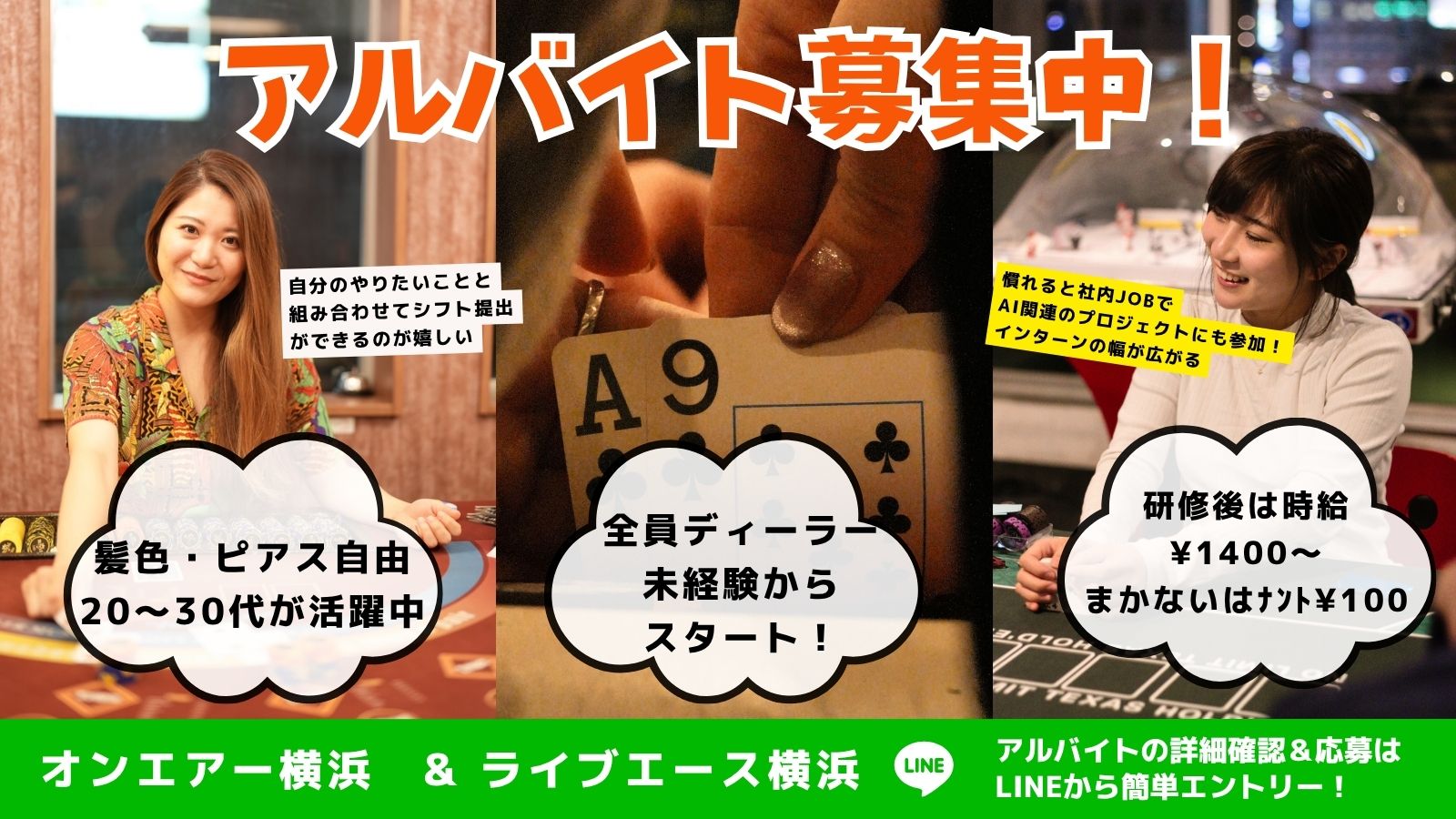 アルバイト募集 ここからラインで簡単問い合わせ オンエアー横浜では、カジノディーラーを募集しております。 未経験でも1から技術をお教えいたします。 わくわくどきどきを演出します!お店自慢のごま唐揚げ<唐揚げGPにも出場あり!>ポーカーディーラーを目指しませんか?くすみピンクの女性に優しい店内みんなでディーラー研修会!レアなバイトしませんか? 横浜エリアナンバー1のアミューズメントカジノ!>>未経験者大歓迎!<<憧れの職業「カジノディーラー」になりませんか?オンエアー横浜は横浜エリア人気ナンバー1のアミューズメントカジノです!毎月800名近いお客様がご来店されています。勢いのあるお店で、ディーラーとして一緒に働きませんか?未経験でも安心!業界15年のベテランディーラーが直接研修いたします。未経験、フリーター、大学生の方大歓迎飲食店経験者・音大出身者優遇致します!